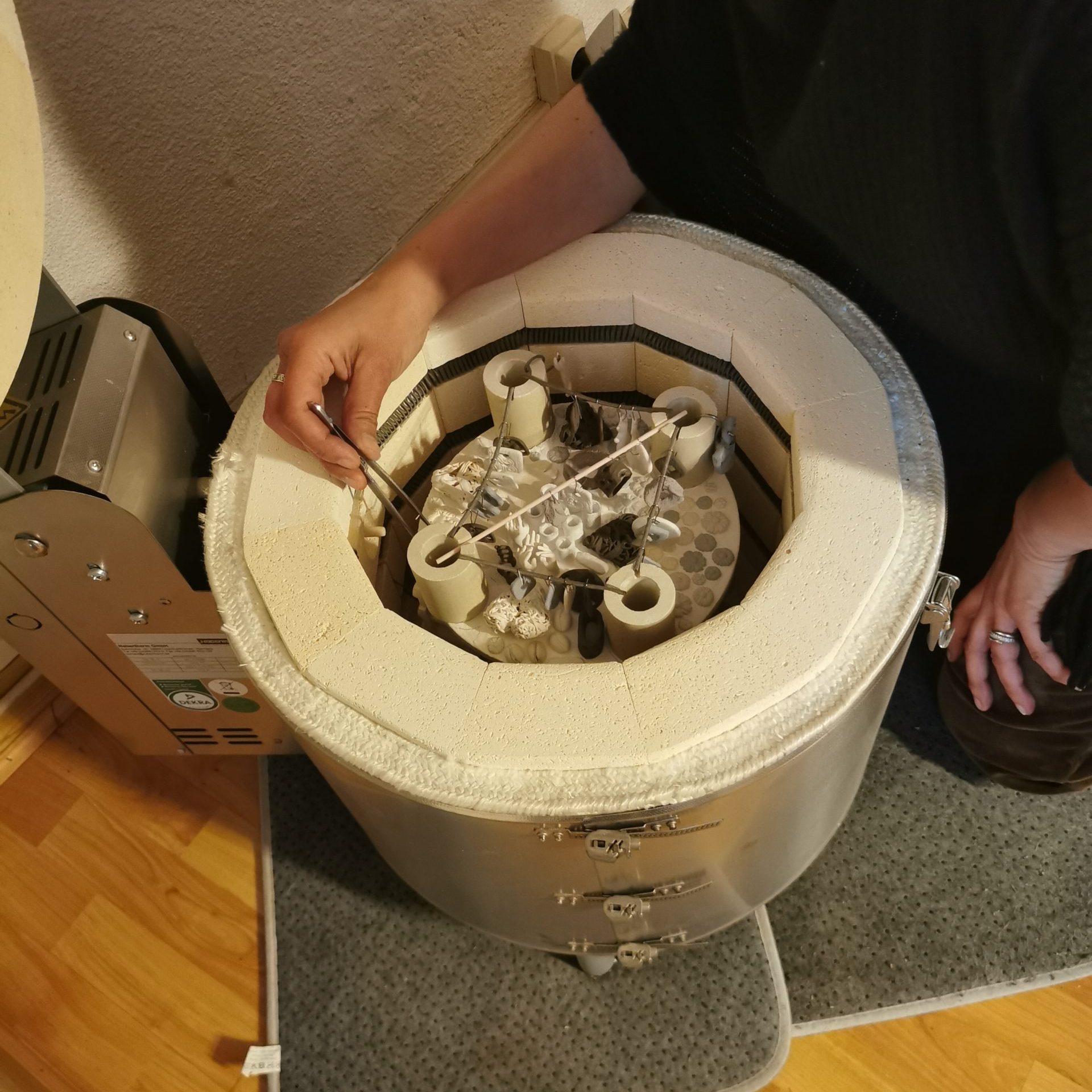 Une première cuisson, autour de 980 °C, donne à la pièce sa solidité initiale. Vient ensuite l’émail, cette fine pellicule de verre qui apporte couleur, douceur ou brillance. Une seconde cuisson, cette fois à 1300 °C, fait naître la véritable porcelaine : résistante, lumineuse, presque vibrante.