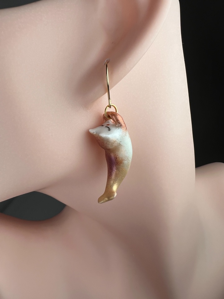 Ces boucles d’oreilles en porcelaine style chat sont sublimées par des touches de peinture métallisée. Un accessoire raffiné qui combine l’élégance de la céramique et la modernité d’une finition brillante. Idéales pour une note de fantaisie chic.